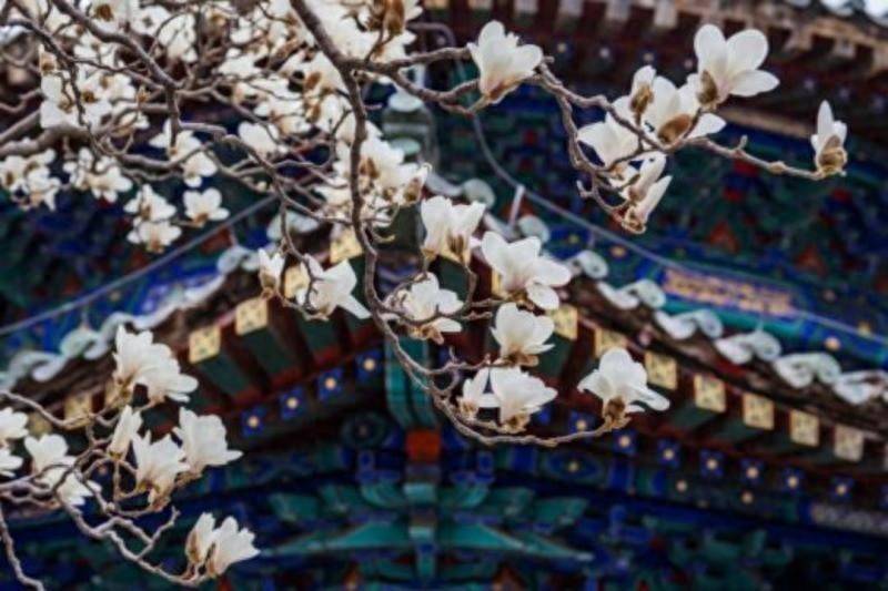 亮点:明代二乔玉兰盛放,紫白花瓣与红墙黛瓦相映,古寺春光自带诗意滤镜